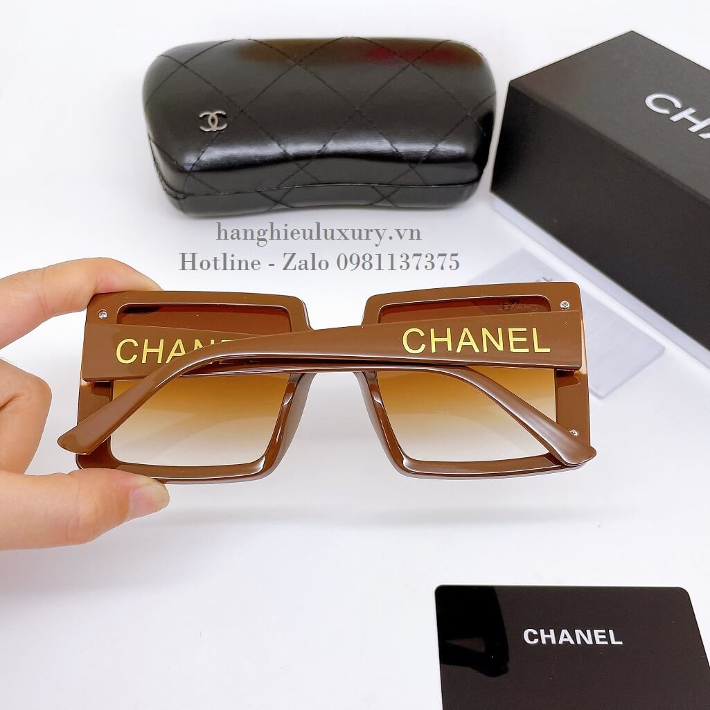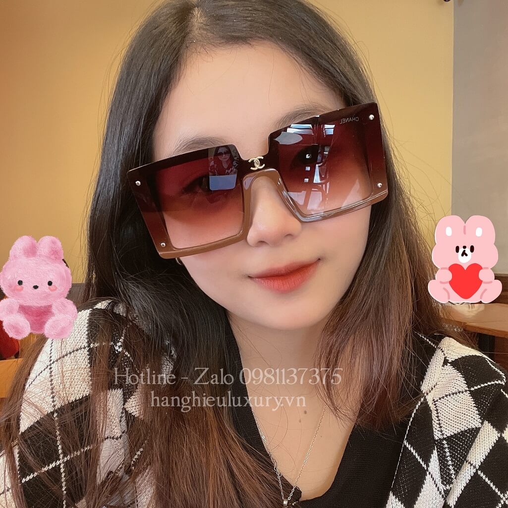 Chiếc kính Chanel dáng vuông form to bản lớn, màu nâu trầm ấm cực kỳ sang trọng, giúp tôn mặt – che khuyết điểm và tạo điểm nhấn đắt giá cho tổng thể outfit.