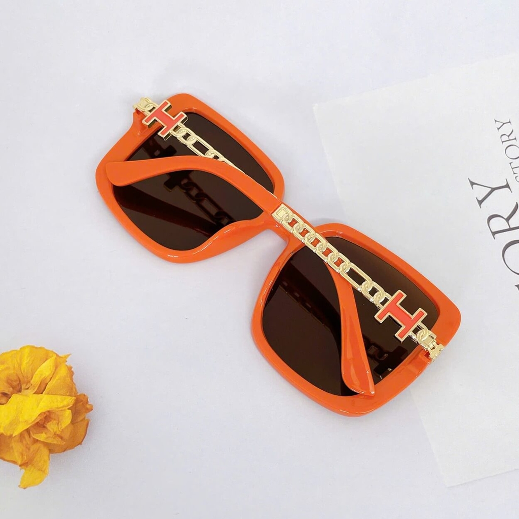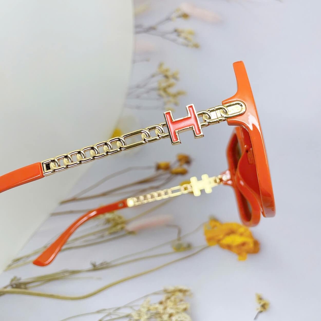 MẮT KÍNH THỜI TRANG NỮ - KÍNH HERMES NỮ VUÔNG MÀU NÂU VIỀN CAM GỌNG CHỮ H PHỐI MẮC XÍCH CAO CẤP
