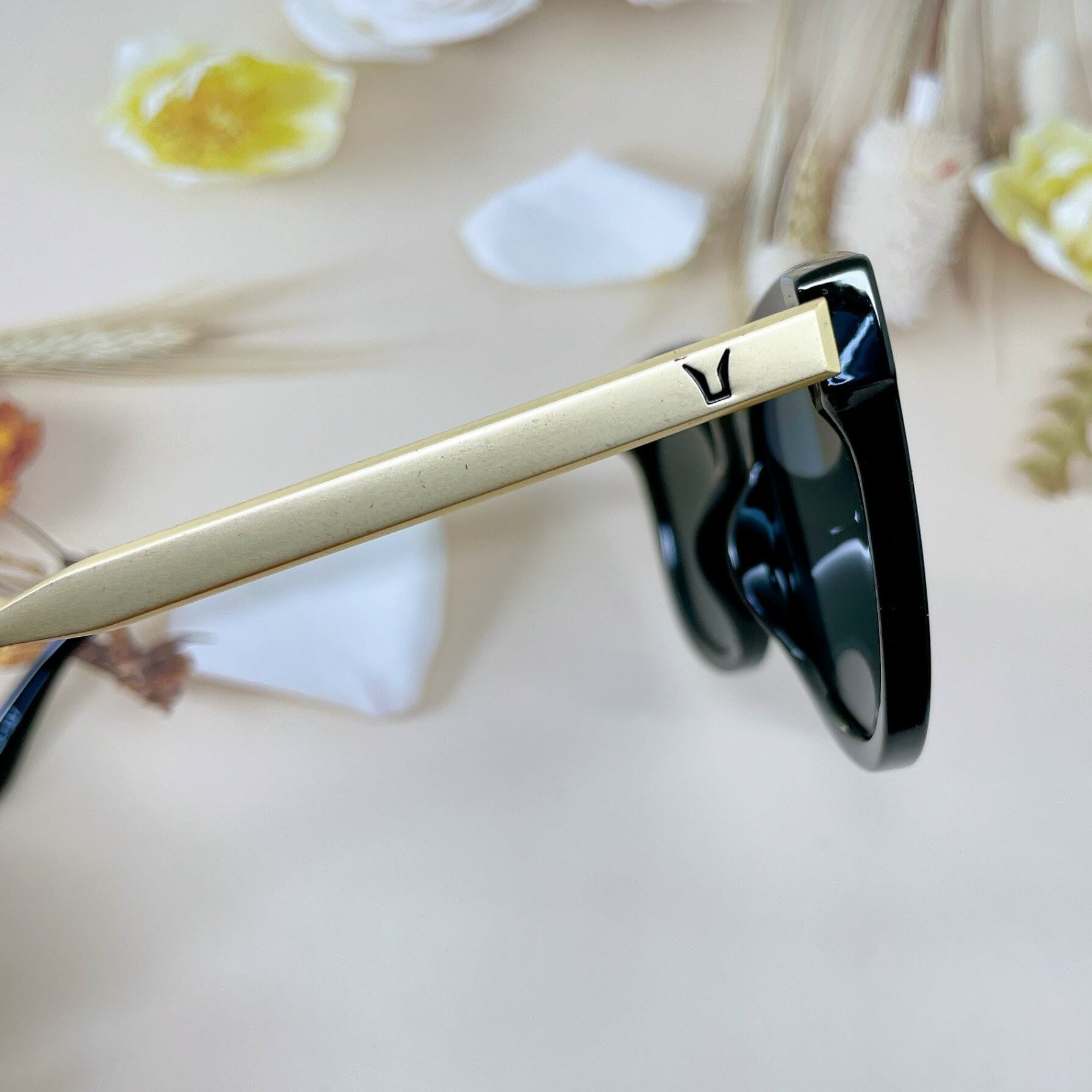 Chất liệu: Nhựa cao cấp, gọng kim loại khắc chữ V